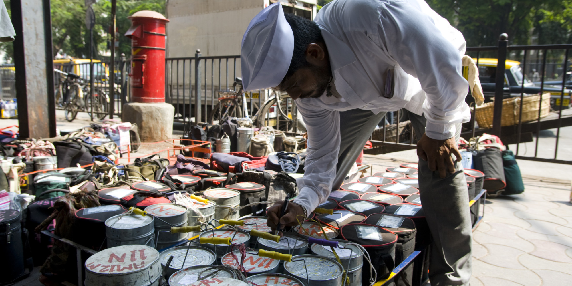 IMG_1435 ← Previous Next → Dabbawalas sorting tiffin lunch boxes before delivery in front of Churchgate railway station.